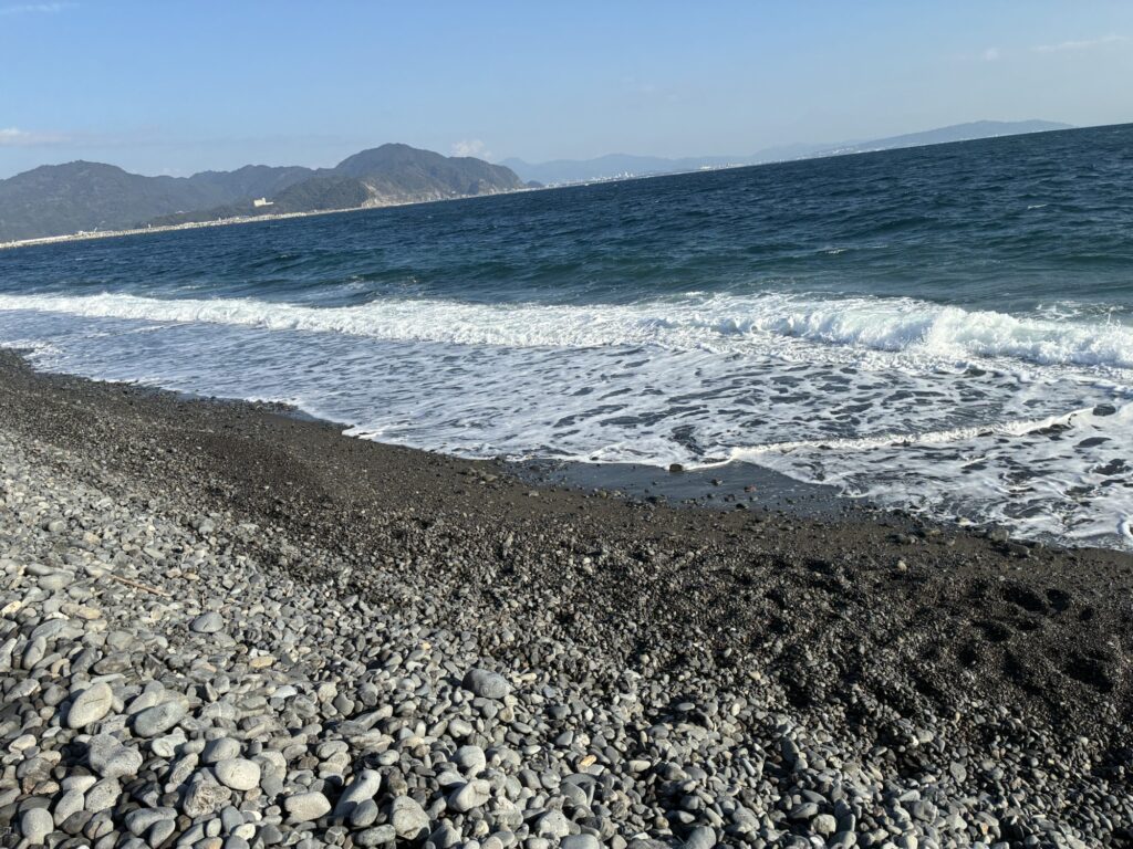 静岡サーフは砂浜というより、ゴロタ浜が目立ち、拳ほどの石が一面広がります。
