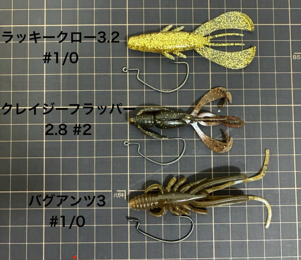 僕は3.2インチワームに#1/0か#2/0のオフセットフックをセットしますが、たまにどっちを使おうか迷います。