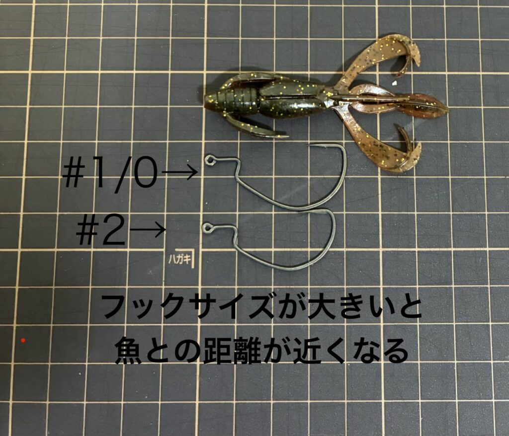 これはワームの動きが良くなるのに加えてフックサイズが小さいと物理的にフックが口の中に入りやすくなり、小さいサイズの魚も釣れるようになるのでキャッチ率は必然と上がります。